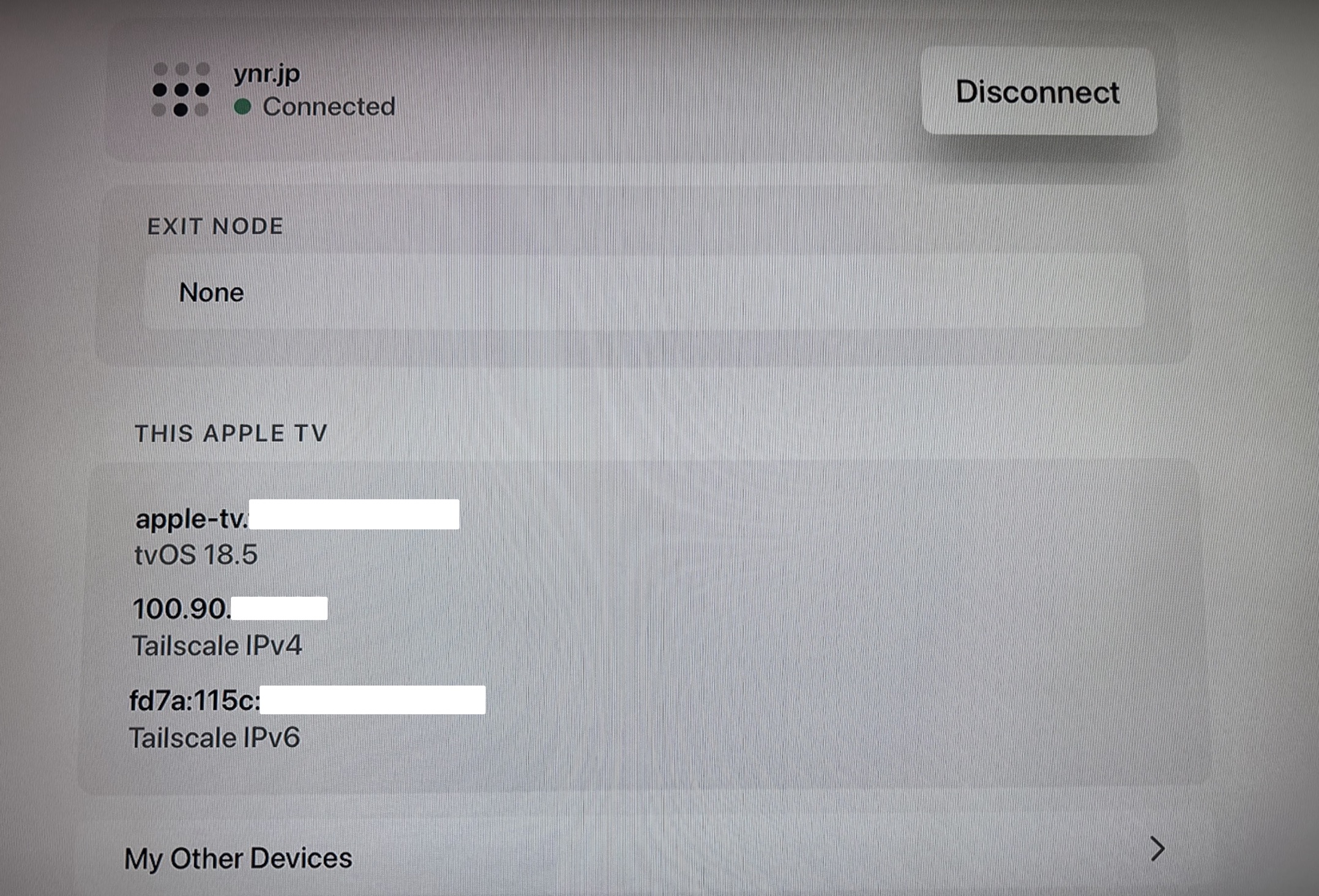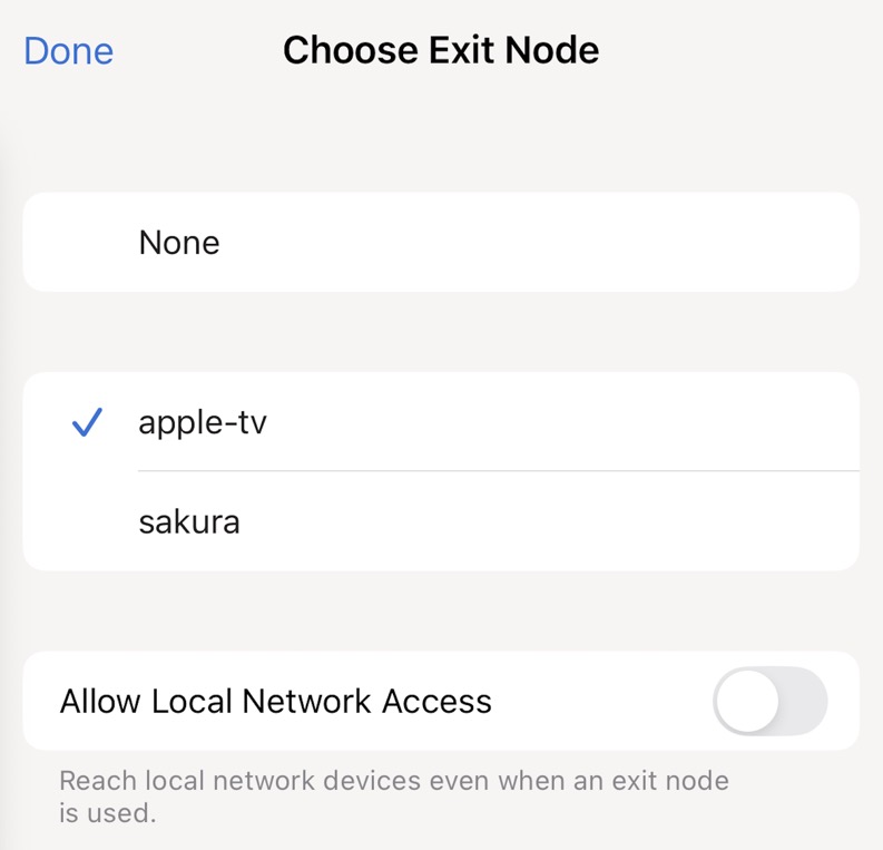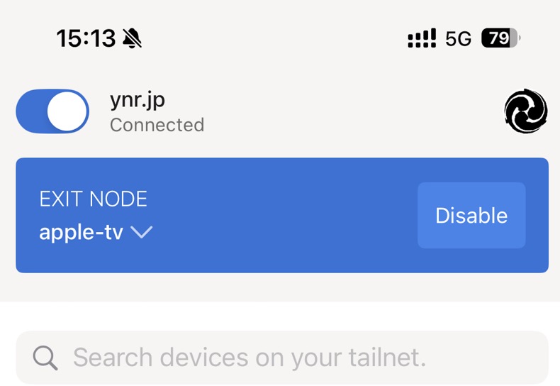 Exit Nodeに接続できると青く表示されます。これでスマホのすべての通信は自宅のApple TV経由で接続されるようになります。