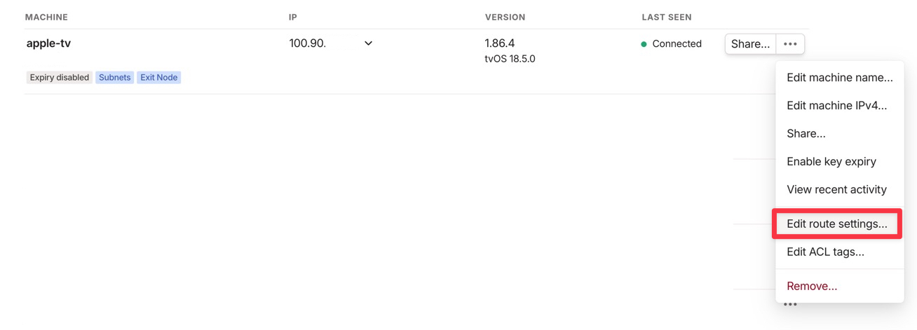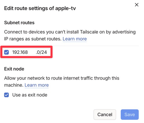 現状ではTailscaleをインストールした端末同士は、割り当てられた100で始まるIPアドレスで通信可能です。ただ自宅のすべての機材にTailscaleをインストールするのは面倒くさいですし、NASなどTailscaleをインストールできない機器もあります。その場合Subnet Routesを設定することでApple TV経由で自宅内の他の機器にアクセスできるようになります。