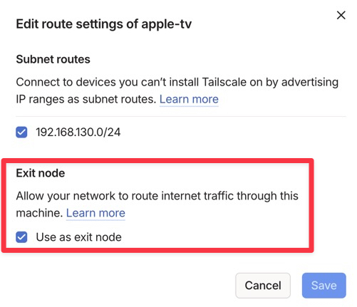 Exit Nodeの設定をすることで、スマホなど外出先の通信を暗号化してApple TVを経由して送信できます。この設定を行うことで海外から自宅のIPアドレスを利用できます。