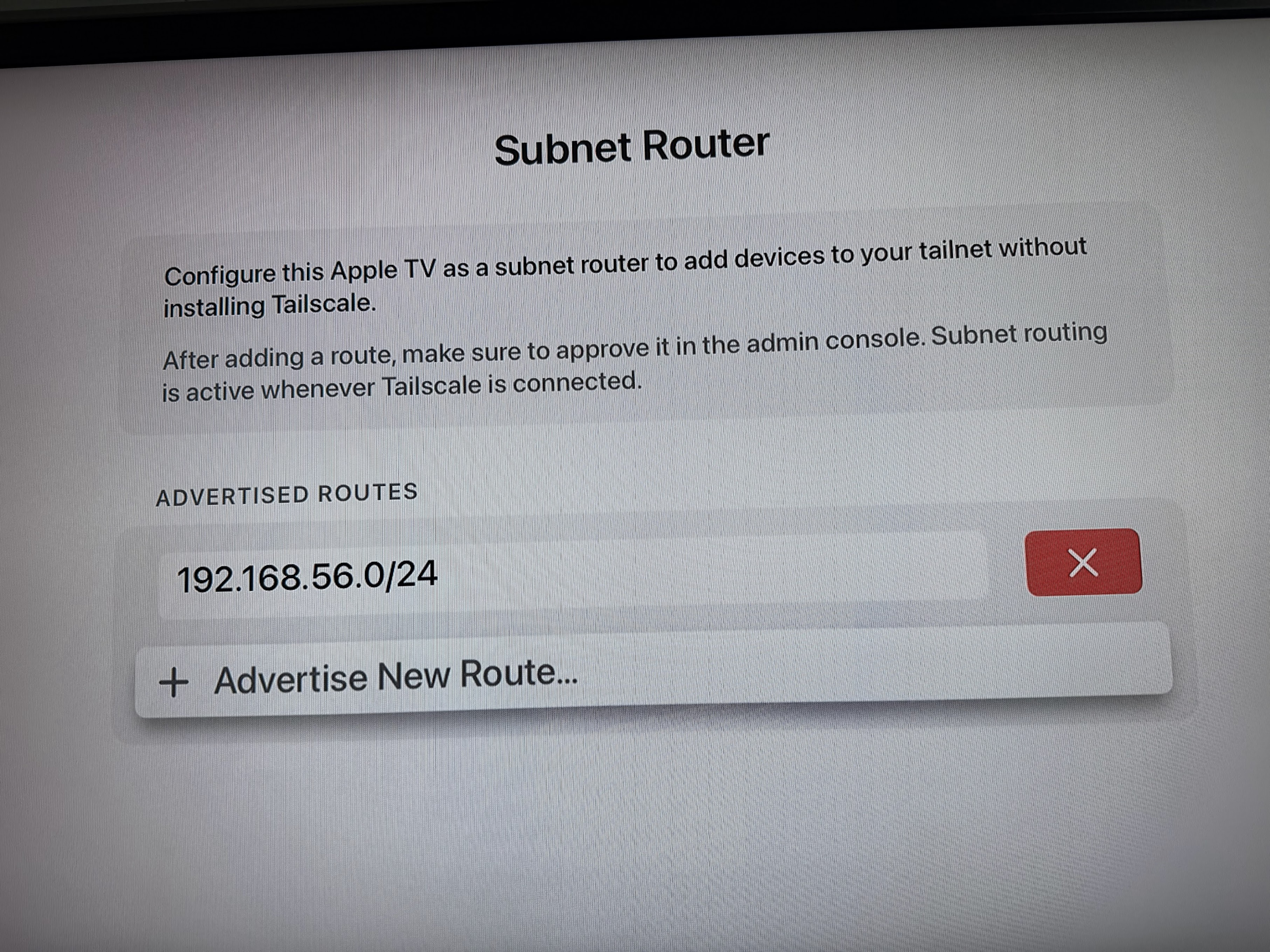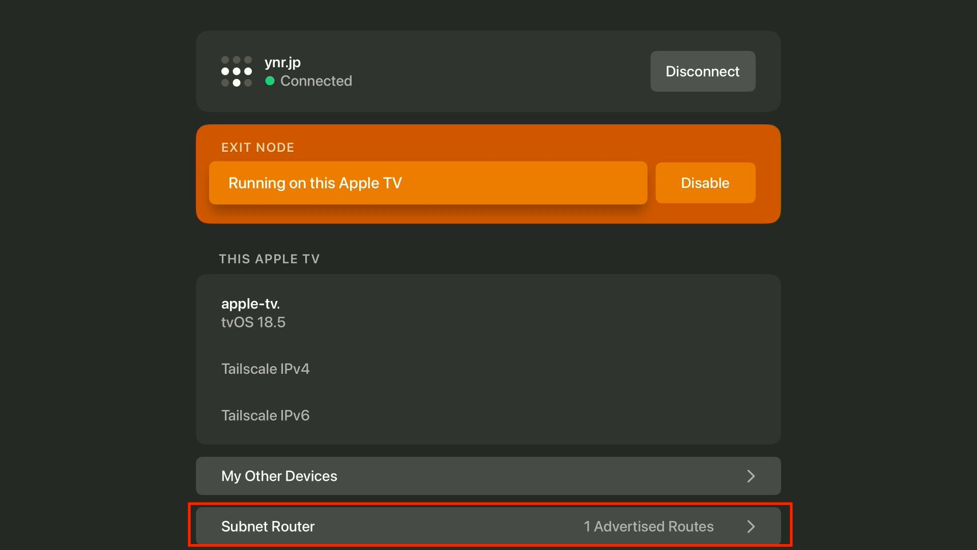 Apple TV側のTailscale設定で「Subnet Router」を選択します。