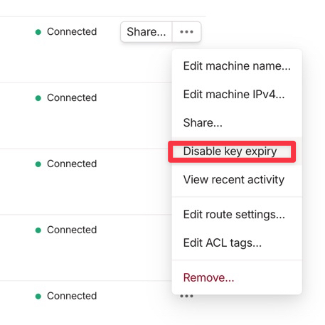 そのためWebのTailscale管理画面から「Disable key expiry」を有効にしておきます。若干セキュリティ的には良くないかもしれませんが、いざという時に接続できないよりはマシです。