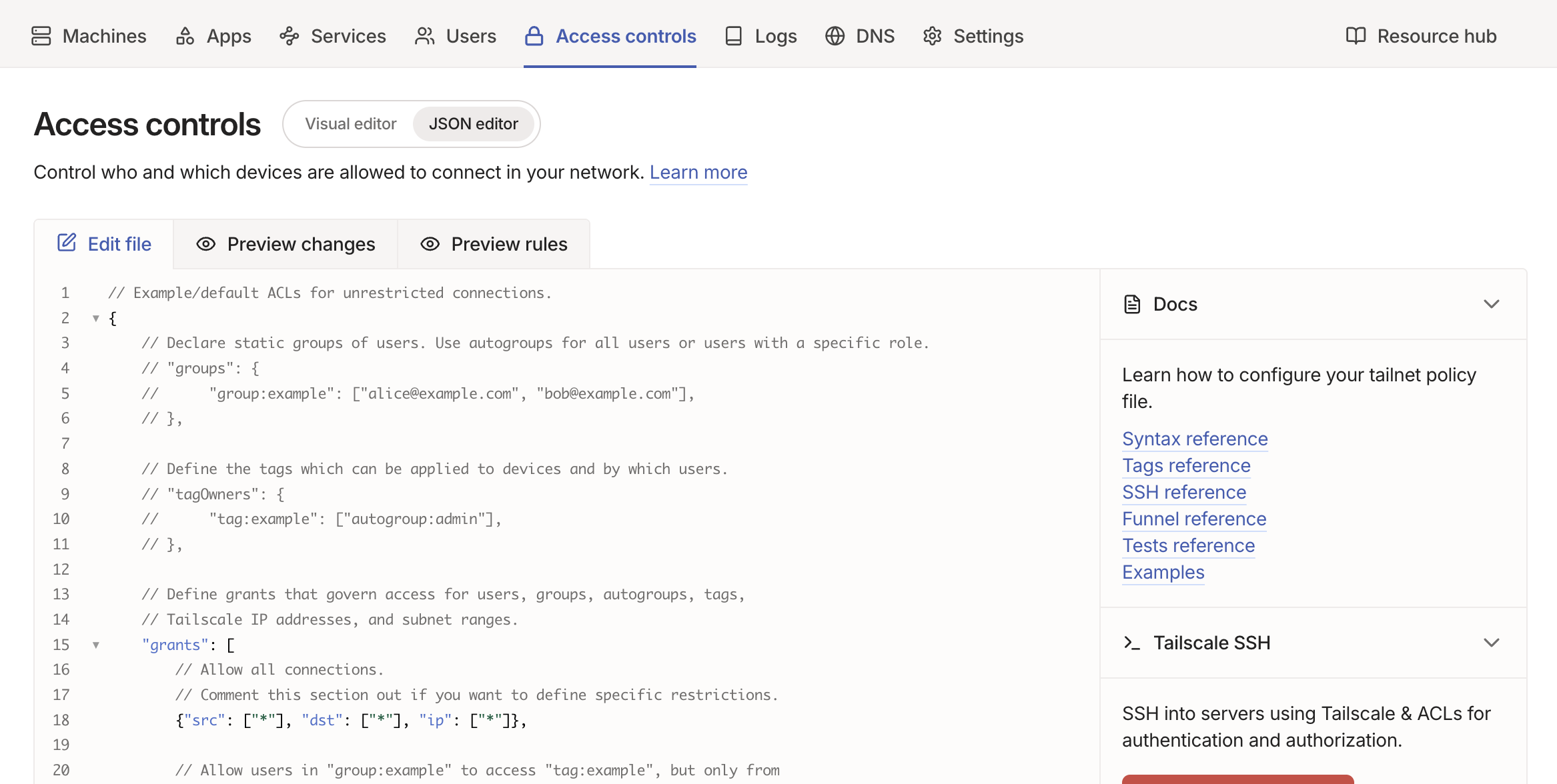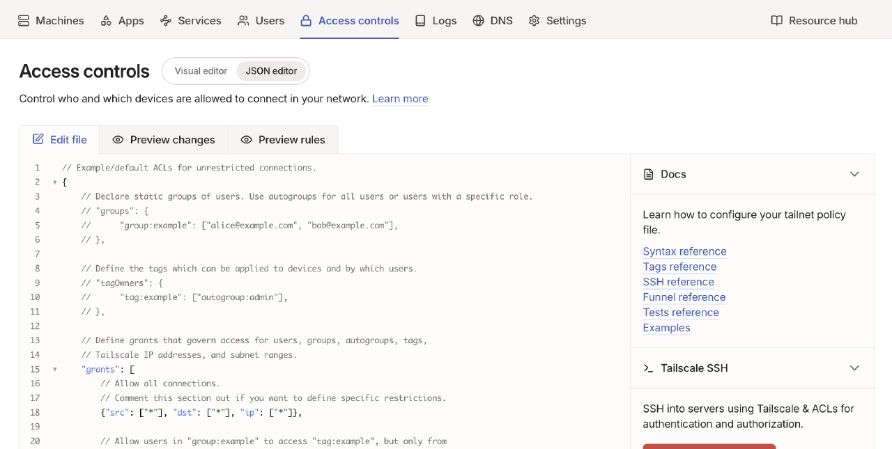 Tailscaleはアプリ起動するだけでお手軽にネットワークを構築できるサービスです。お手軽だから設定が少ないということはなく、Access Controls設定でさまざまな設定が可能です。