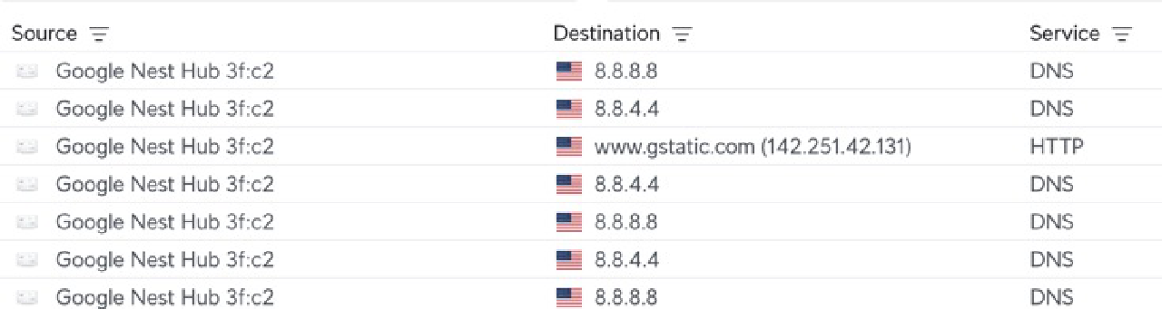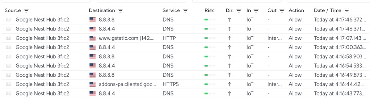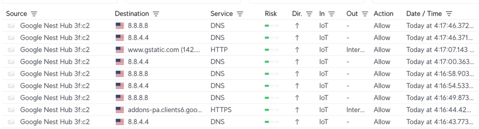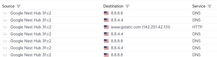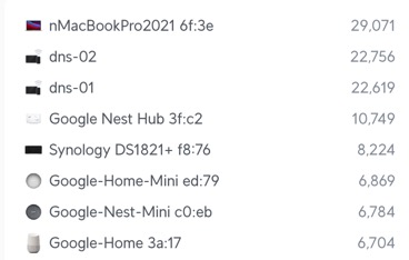すべてがDNS通信ではなく、Google Homeから通信すべてをカウントしたものですが24時間で各デバイス7千〜1万回の通信が行われています。この通信数は内部宛の通信もカウントしていますが、宅内メインのNASより多い通信数をしていて異常とも言える通信数です。