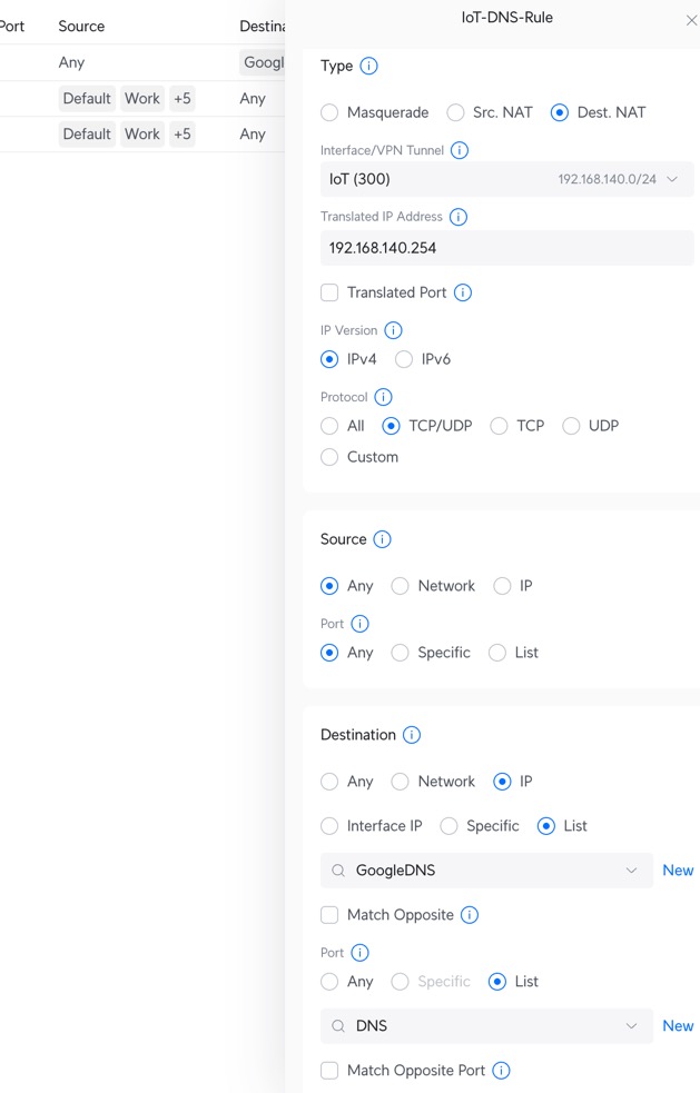 種類はDest.NATを選択します。Interfaceは今回対象としたいIoT用のVLANを指定しています。セキュリティが脆弱になりやすいIoTデバイスをVLANを分けてネットワーク分離を行っています。今回指定するオンプレのDNSサーバーと同じVLAN内にある場合はSourceの設定を正しくしないとすべてのDNS通信がループしてしまうので注意してください。