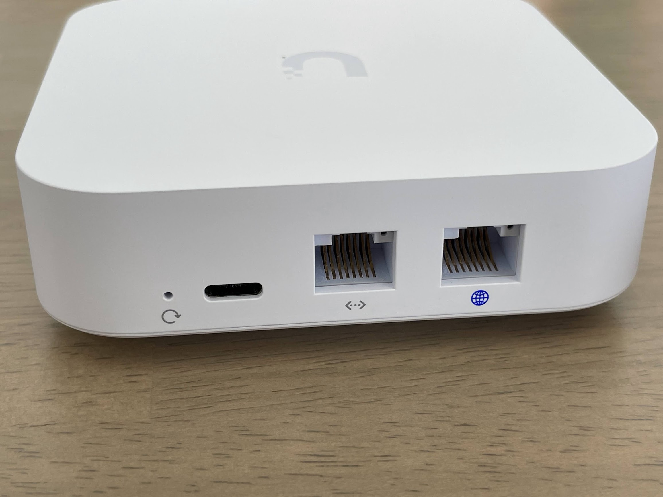 本体側のコネクタもシンプルです。左からリセットボタン、電源USB-C、LANポート、WANポートです。