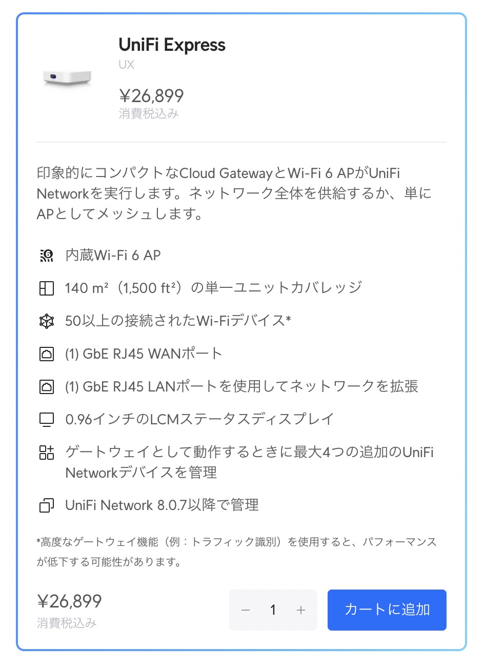 小型な上にアンテナ内蔵のため個別のAPと比べると電波はどうしても見劣りしますが、UniFi Expressに別途APを追加することも可能なので扱う端末数が少ない場合は良い選択肢になると思います。