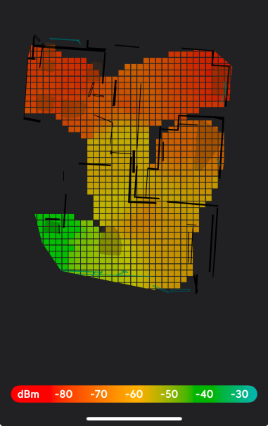 UbiquitiのWiFimanアプリでヒートマップを作成してみます。アンテナ内蔵であり、さらに設置場所が奥まった下の方ということでかなり辛いヒートマップになりました。