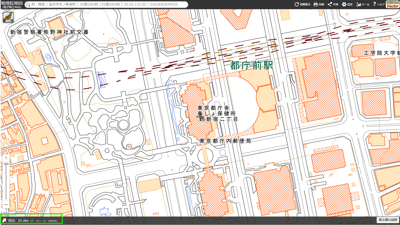 地理院地図の中央カーソルの高度が左下に表示されます。