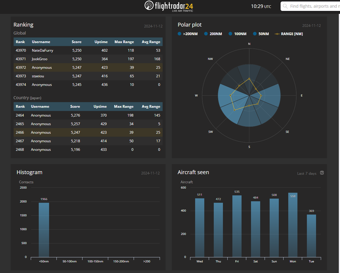 ある程度情報が溜まると下記のようにデータを確認できます。どのくらいの航空機がどのくらいの距離まで見えているか確認できます。屋上で理想的なアンテナ設置がされていると400kmくらいまで見えるようです。戸建ての方はこの結果を見ながら調整してみると面白いと思います。