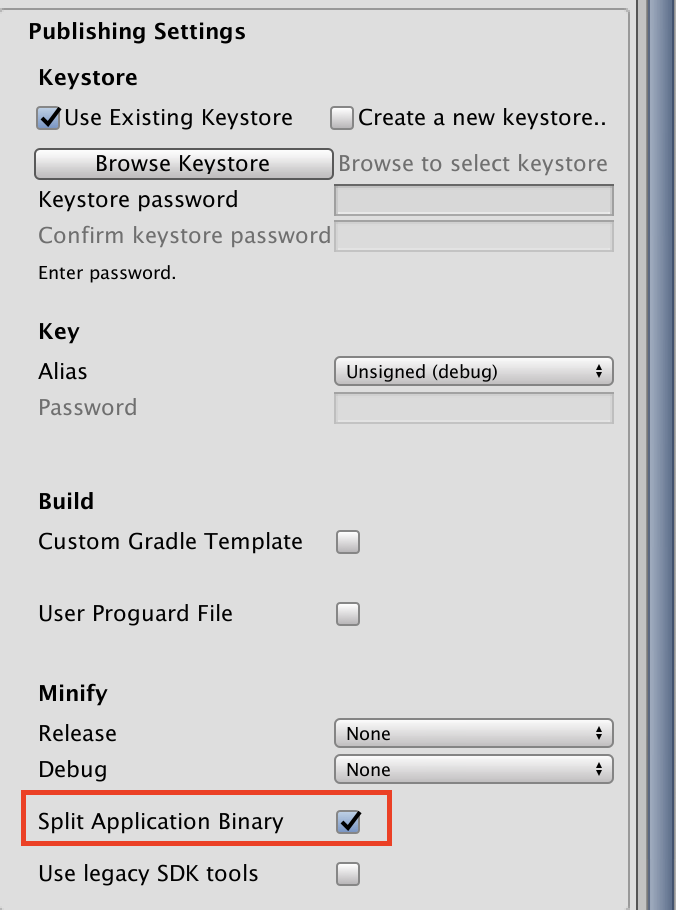 OBBの設定自体はPublishing SettingsのSplit Application Binaryを有効にするだけです。