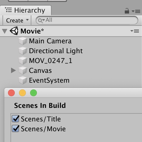 TitleにはMovieに遷移するボタンをコードを、MovieにはUnity標準のVideo Playerで動画を再生させます。