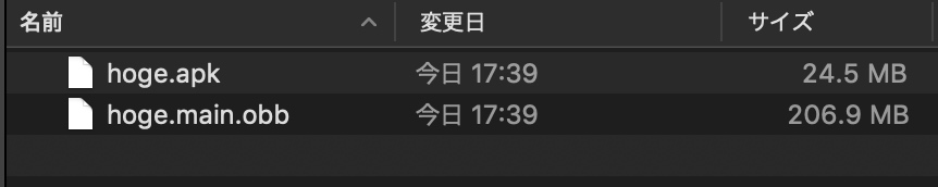 そしてSplit Application Binaryを有効にしてBuildを行うと、Build結果として普通のAPKとOBBファイルが出力されます。